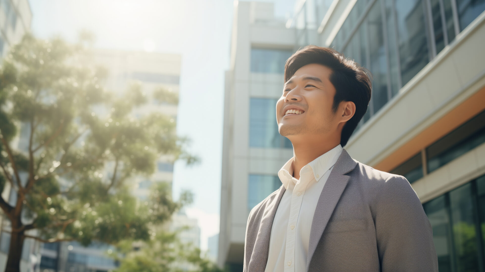 Home / Confident happy smiling Asian businessman standing in the city, / Confident happy smiling Asian businessman standing in the city,