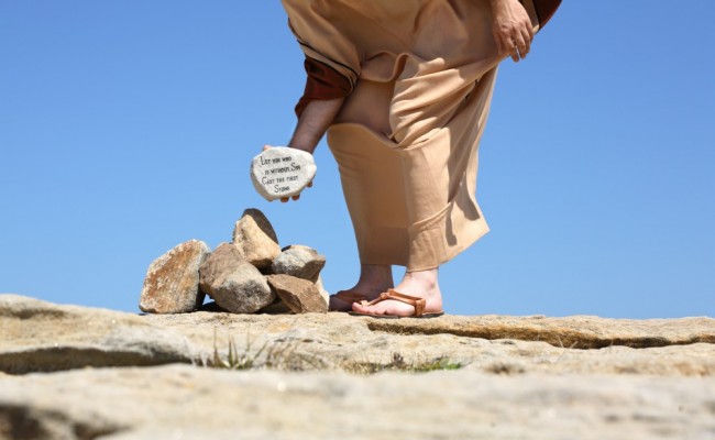 Needless to say, her life hung in the balance, and hinged on Jesus’ reply. Instead of verbally answering the angry accusers, Jesus wrote something in the sand. Amid confusion, tension mounting and the woman’s utter helplessness, Jesus stood and said, “Let the one among you who has never sinned throw the first stone at her.” (John 8:7 Phillips)